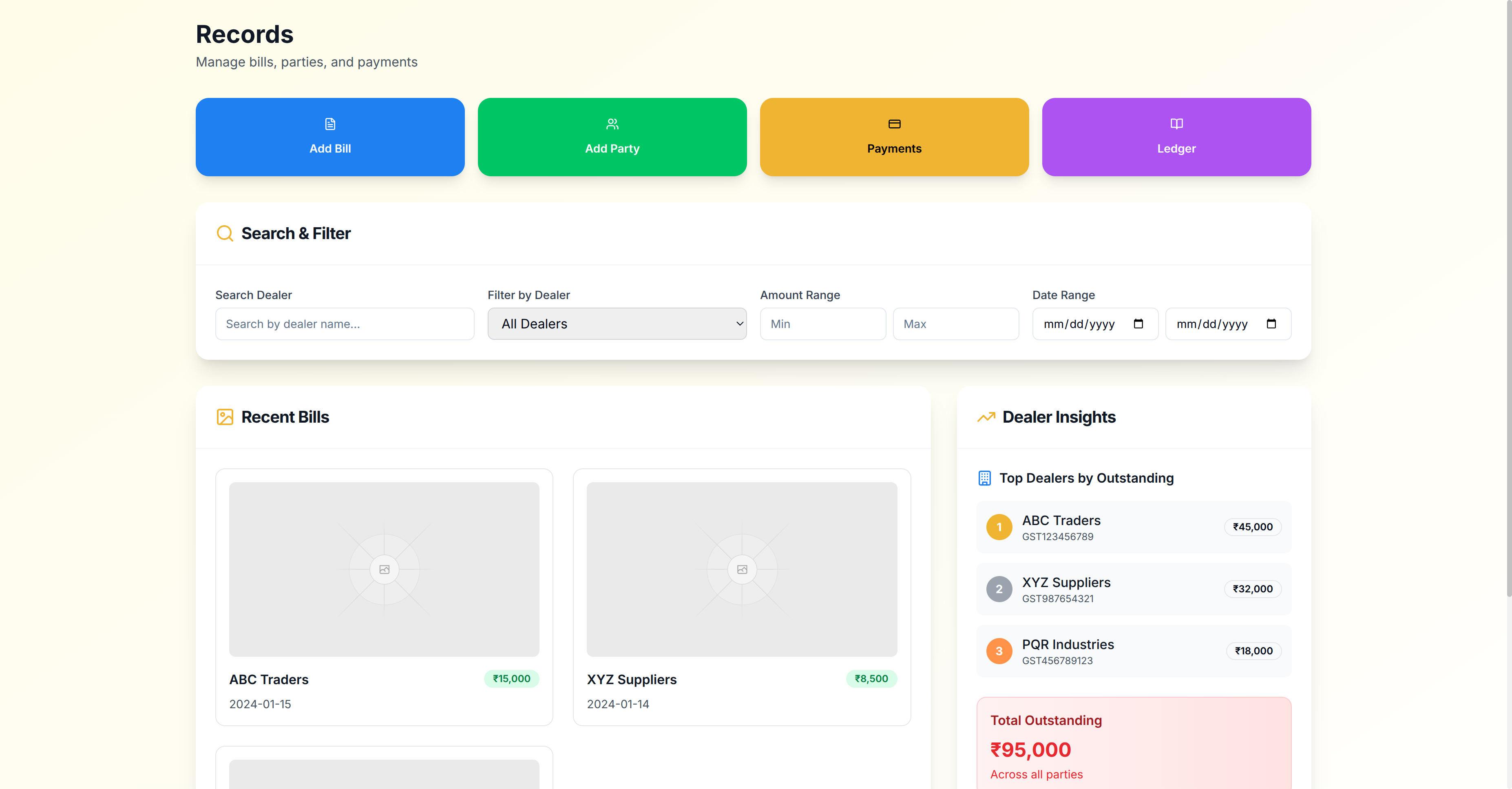 Simplified accounting system for small businesses with digital bill storage, automated ledger calculation, and daily revenue tracking.
